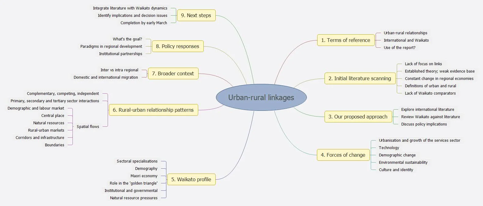 Pictured below is a mindmap that we used for the urban and rural economies review. This was a summarised version that we presented to the clients, to show the areas we were exploring, the emerging themes and the overall structure of the report.